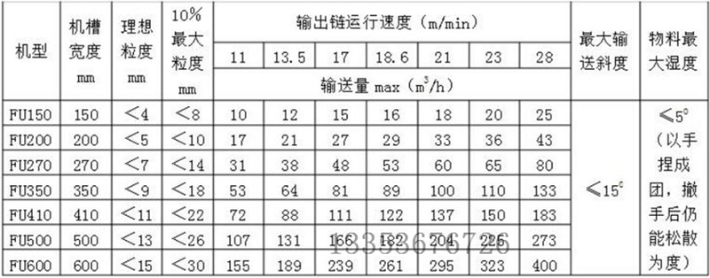 與(yǔ)其它類型的輸送機相比,FU鏈式刮板輸送機具有體積小、輸送能力大的優點,它隻需皮帶輸送機1/5的空(kōng)間或螺(luó)旋輸送機(jī)2/3的空間就能輸(shū)送(sòng)相同(tóng)流量的物料。輸送能力達6m3/h~500m3/h。